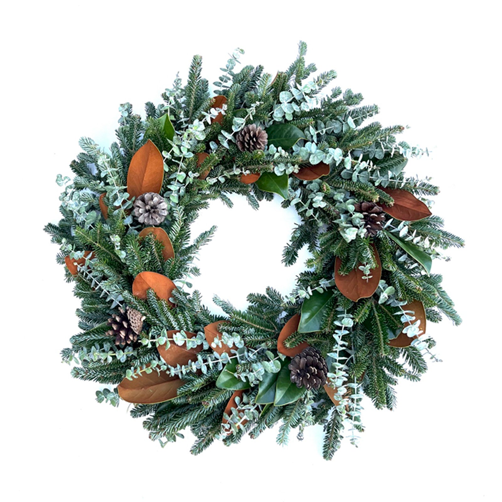 Have a very merry decor with this beautiful wreath. This gorgeous wreath contains Fraser Fir. Baby Blue, Magnolia and Pine Cones. It's perfect to add Christmas colors to your Holiday decor.