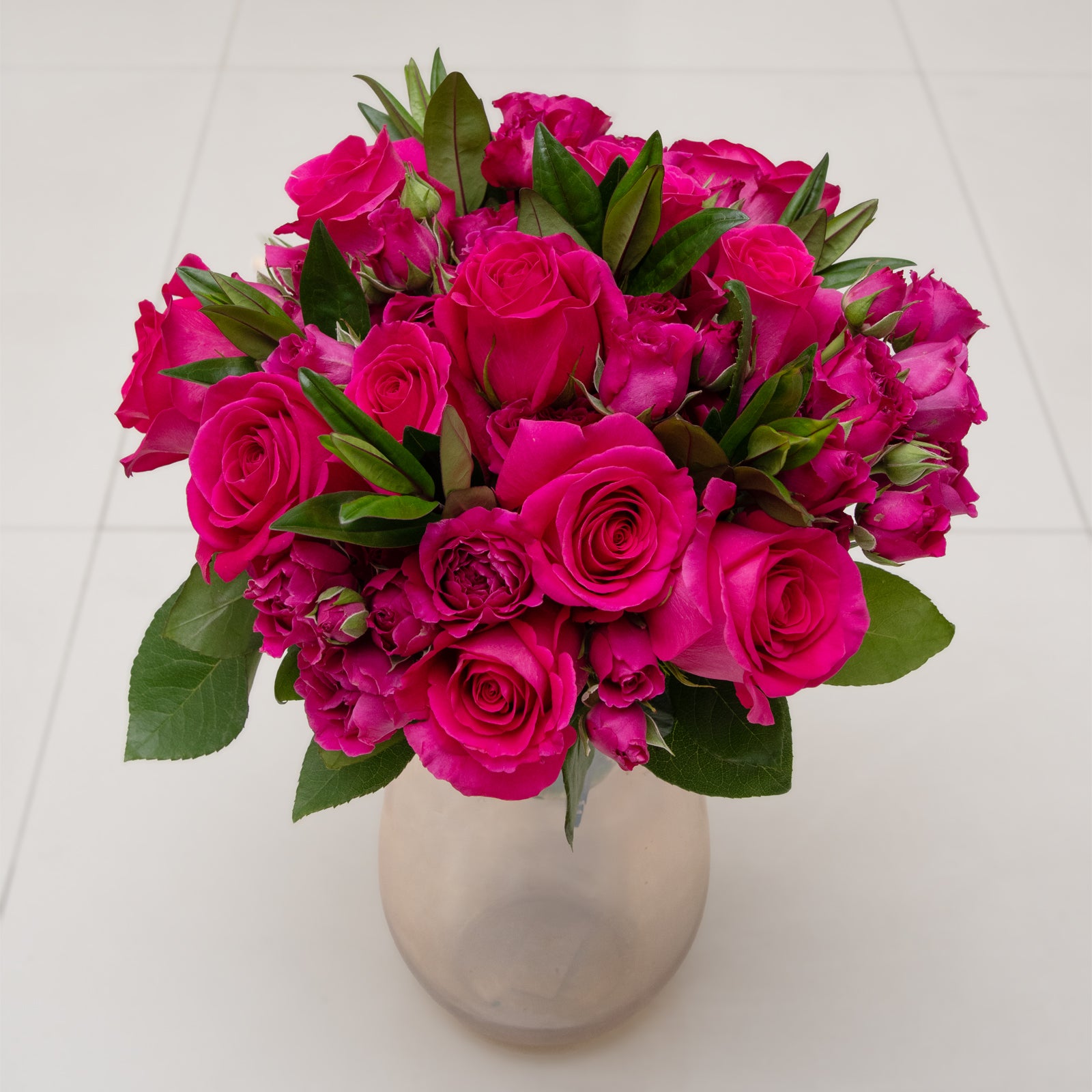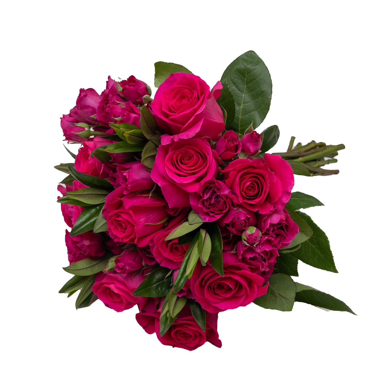 • Stem count: 12 hot pink roses + 10 spray roses + 6 hebes