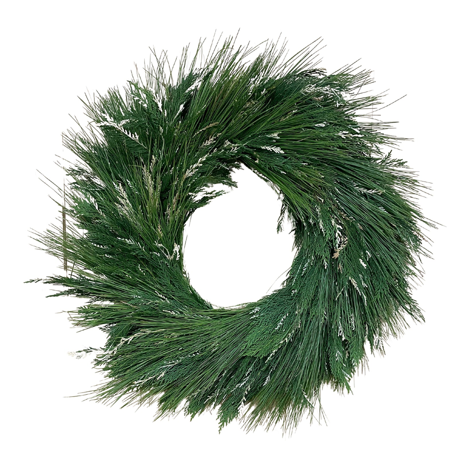 Have a very merry decor with this beautiful wreath. This gorgeous wreath contains Variegated Leyland and Long Needle Pine. It's perfect to add Christmas colors to your Holiday decor.