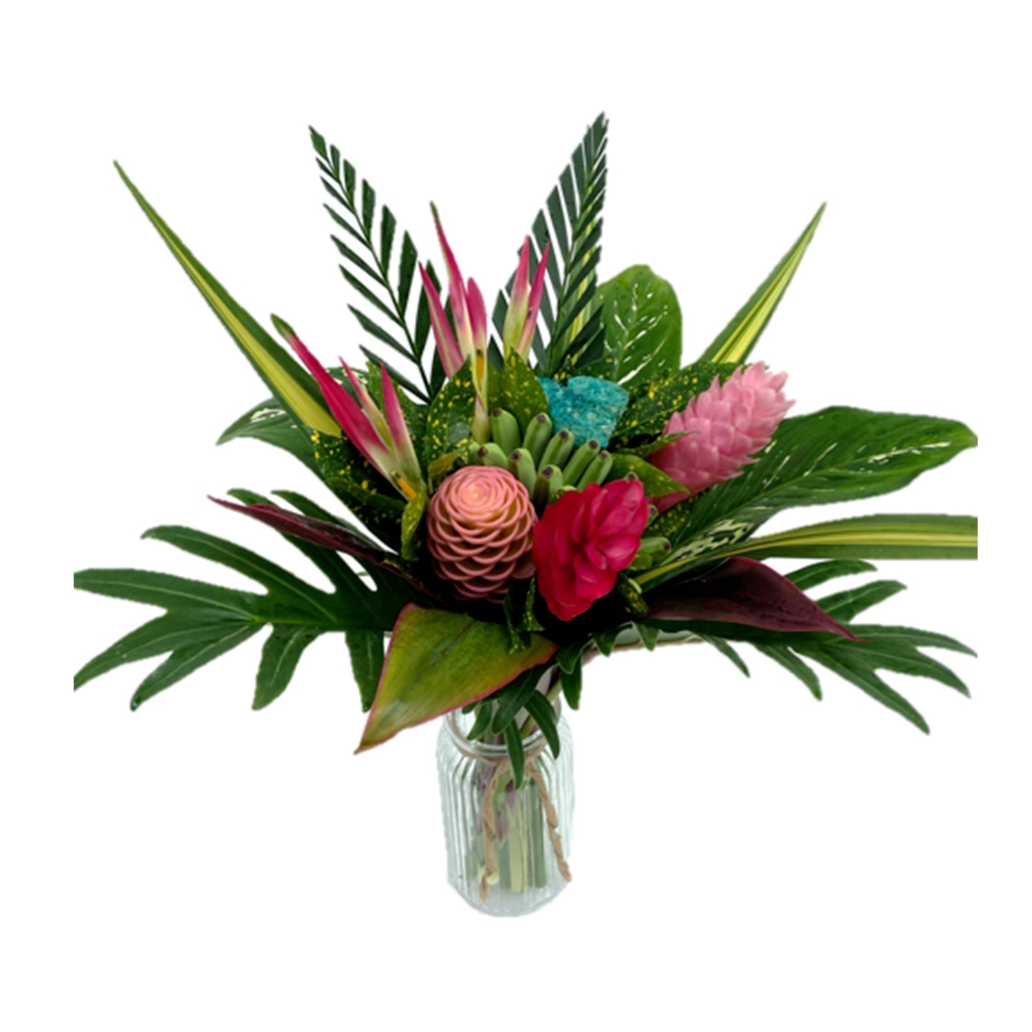 Turn someone's day into a day at the beach with our elegant Caribbean Bouquet. With an abundance of tropical florals and greenery including our ornamental Banana Fingers, Shampoo, Alpinia, Hel Parakeet, Loafa, Pandanus, Arrow Palm, Pandanus, Philodendron, Croton, Dieffenbachia, and Cordelynes in vibrant reds, greens, and turquoise colors. This bouquet will is also the perfect addition to any tropical-themed event or decor.