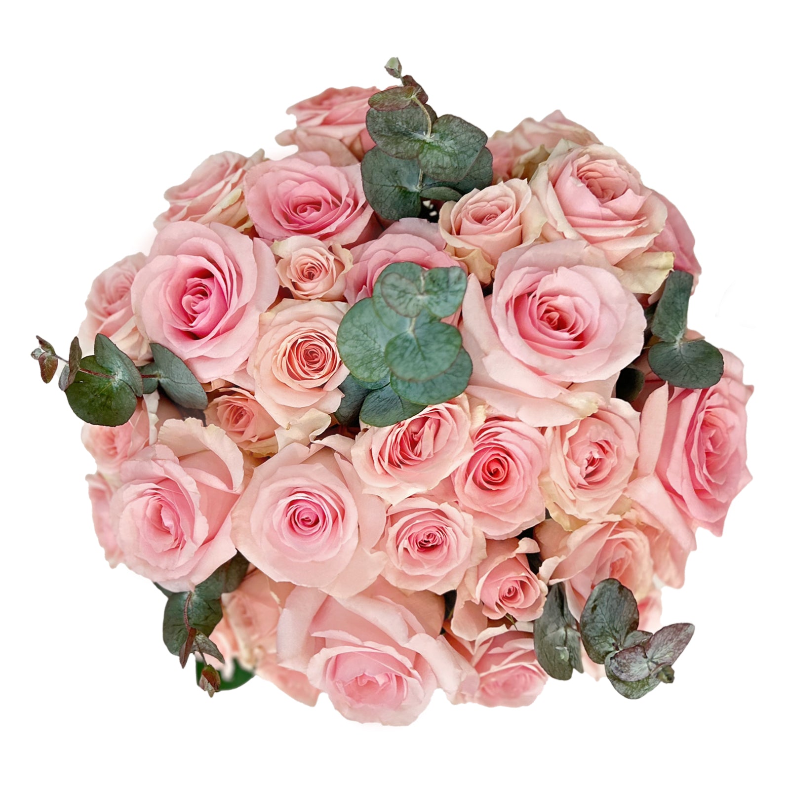 - Stem count: 12 pink roses + 10 spray roses + 6 eucalyptus