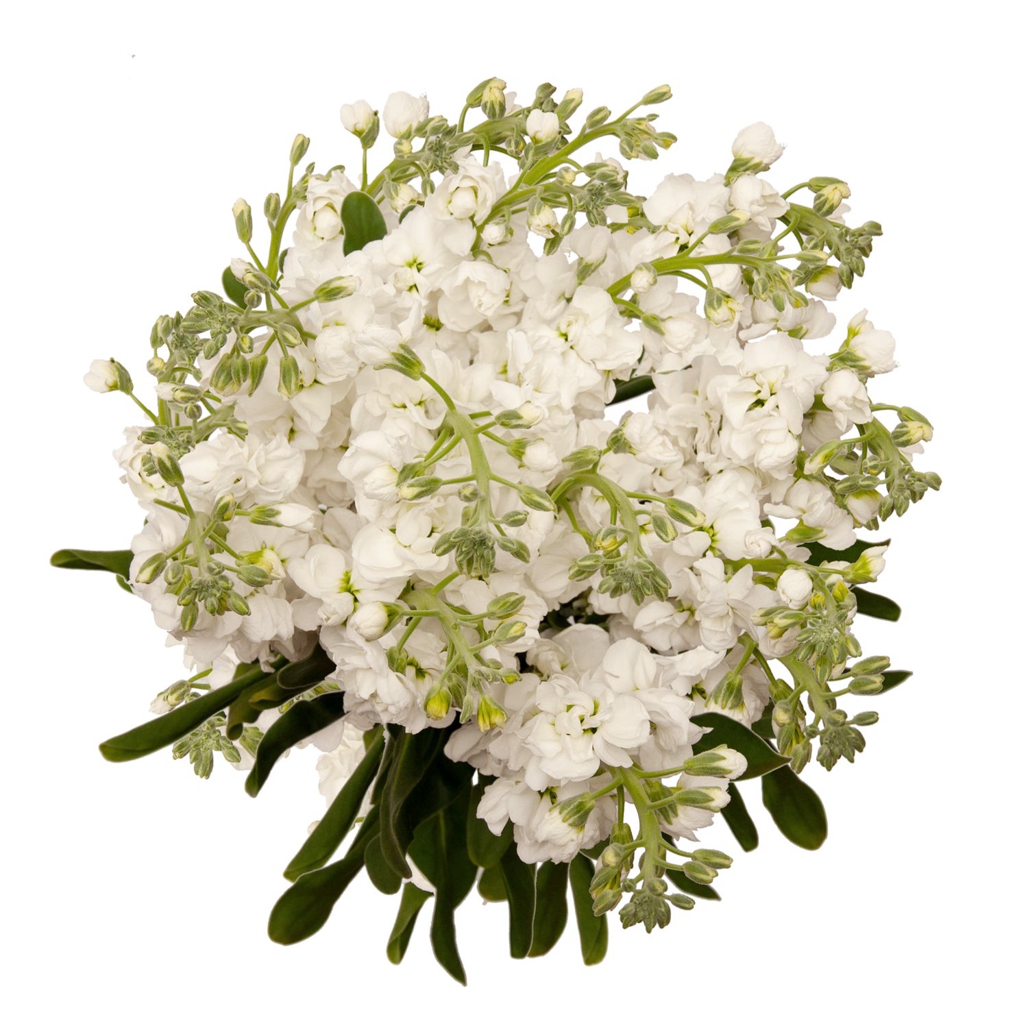 Also known as gillyflower the White Stock Flower represents lasting beauty and bonds of affection and is a graceful flower with ruffled blooms that adorn tall leafy stalks. It is an elegant flower that will look magnificent when added to arrangements of lilies or roses or best of all when you combine it with your favorite focal flower.